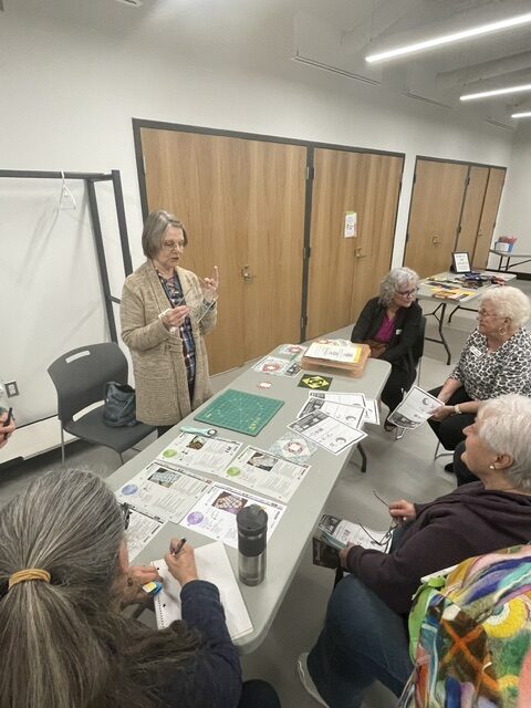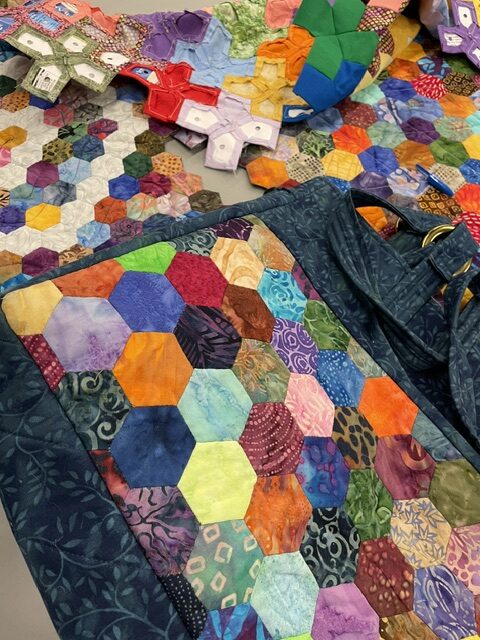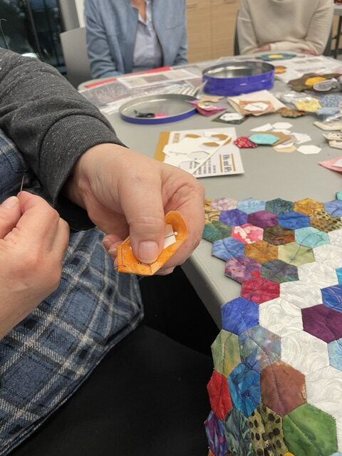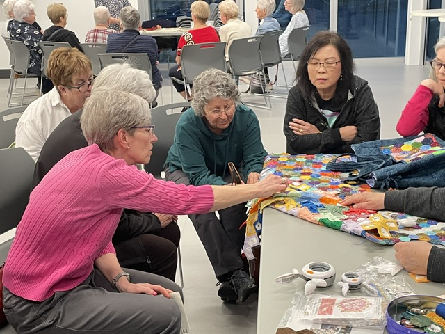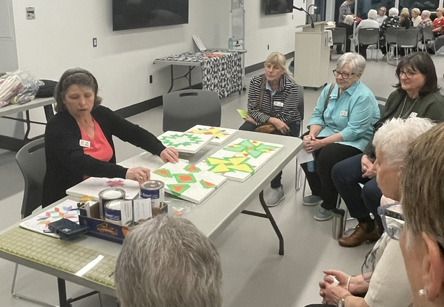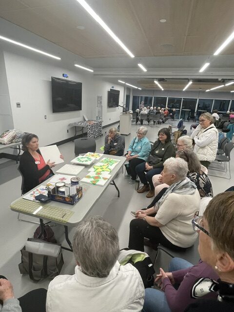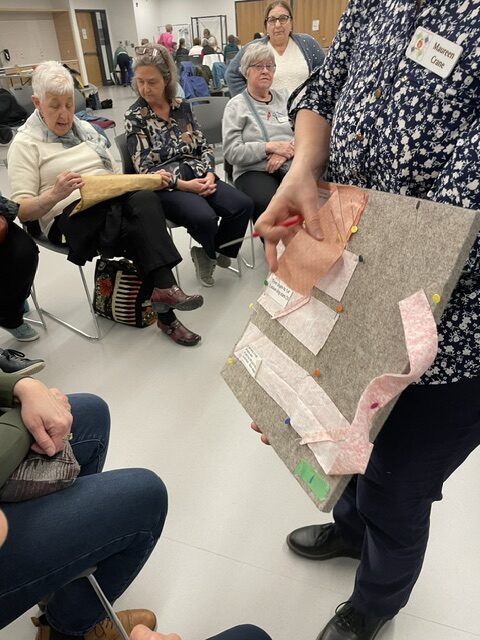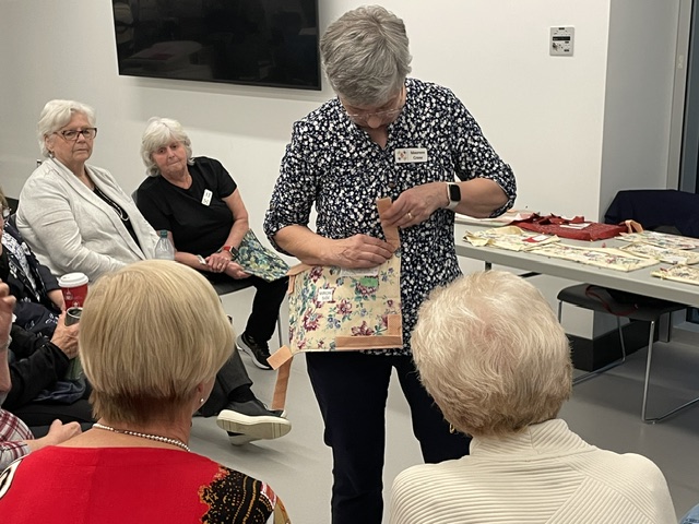 Members enjoyed an evening of learning about 4 quilting techniques. Thanks to Cathy Moffat – Wooden Quilts; Virginia Stranaghan – Square on Square Creative Grids Ruler 6″; Maureen Crane – Binding and Sue Pacquette – English Paper Piecing;